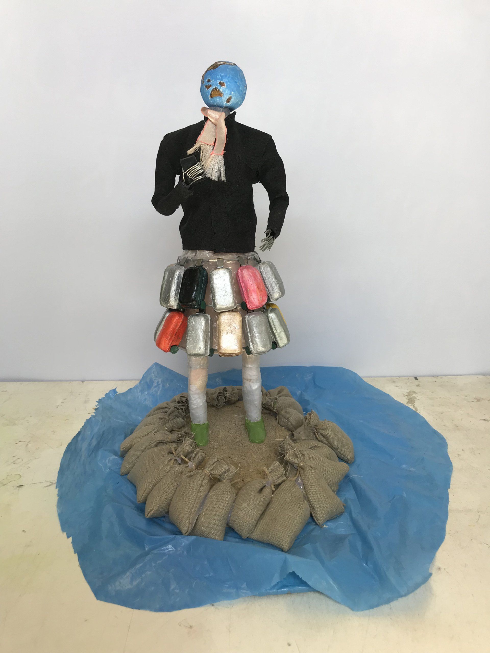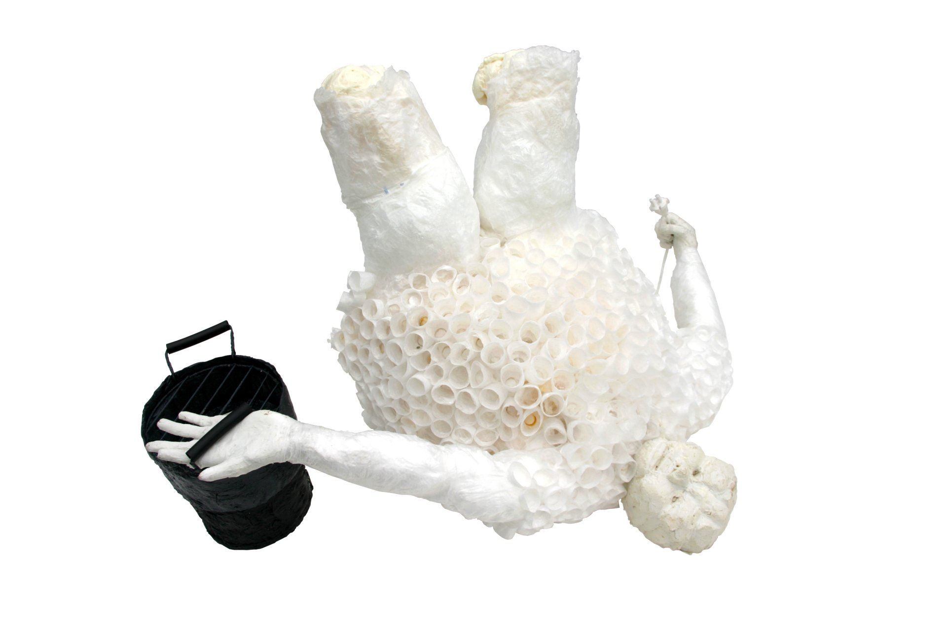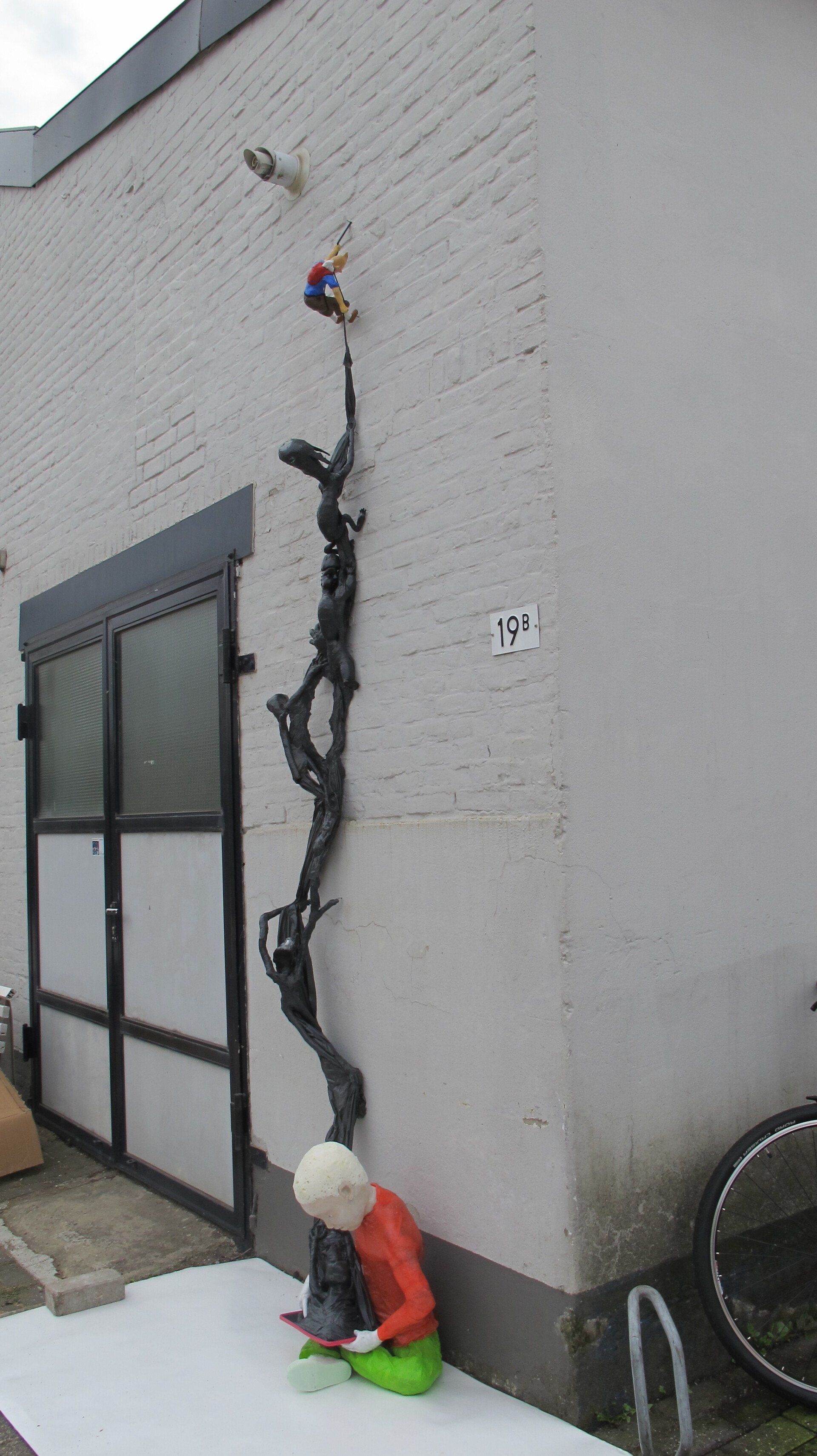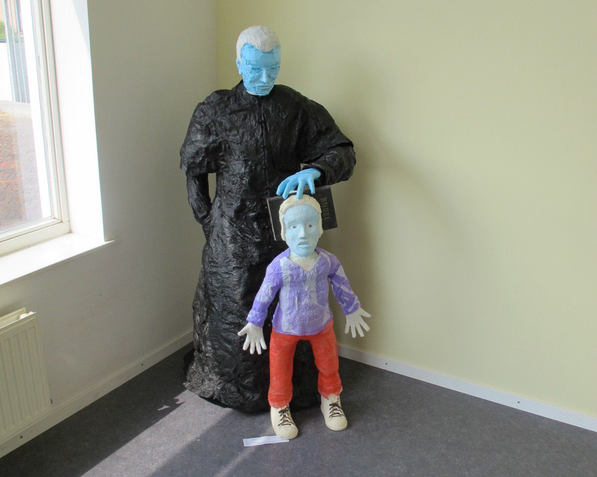 Mijn beelden en installaties zijn levensgroot en gemaakt van o.a. plastic afvalzakken, styrofoam, latex, kit en pur.