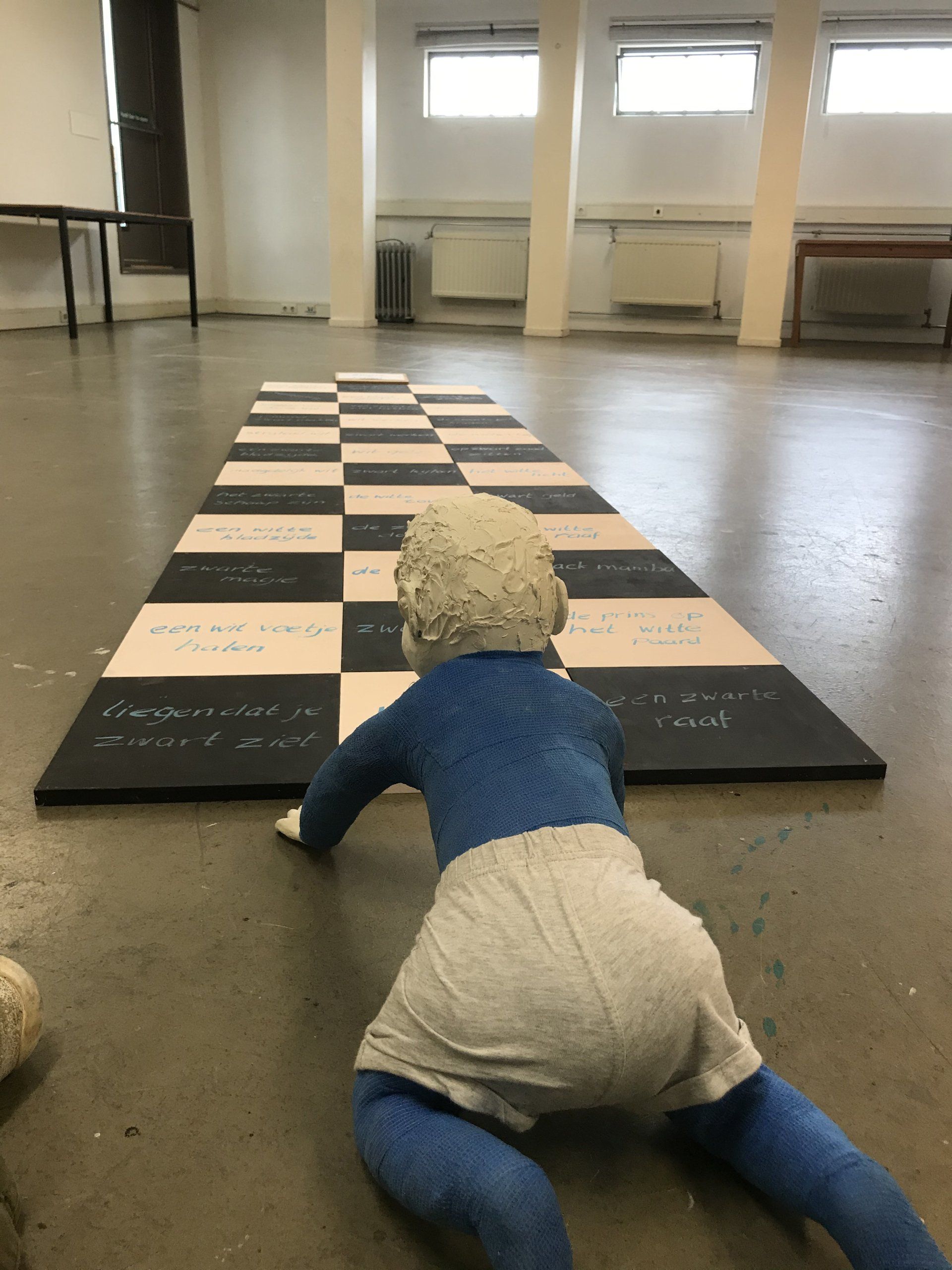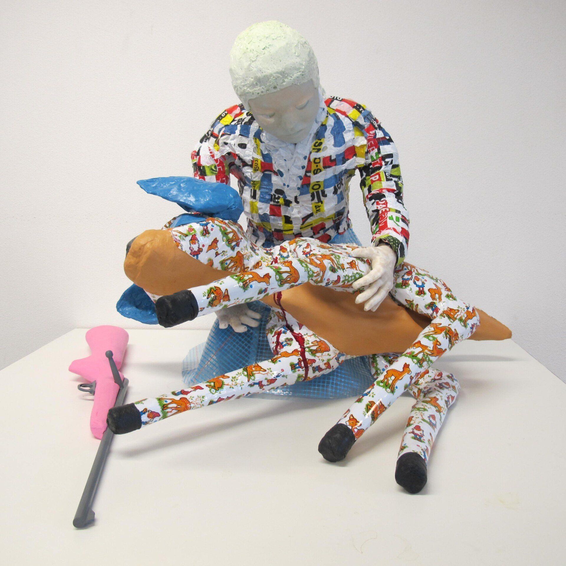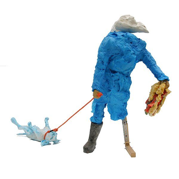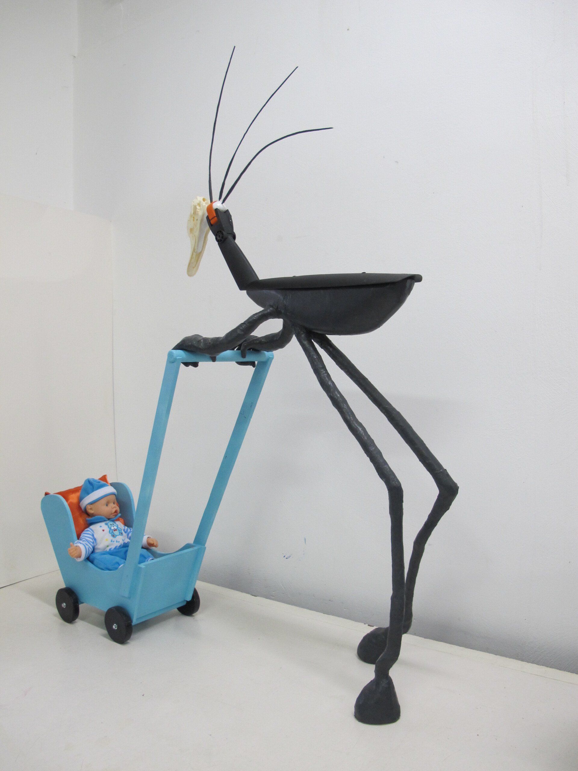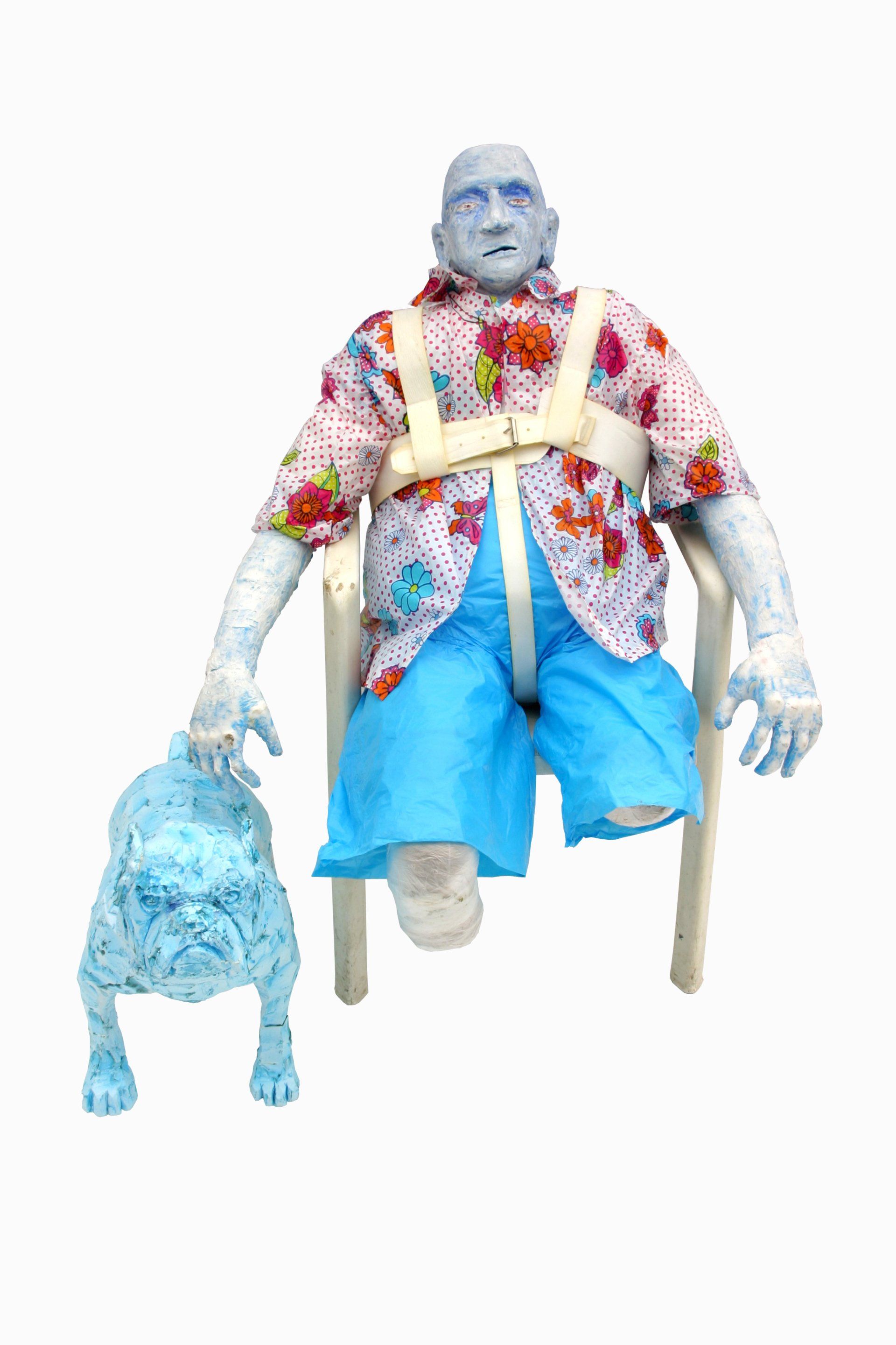 Mijn beelden en installaties zijn levensgroot en gemaakt van o.a. plastic afvalzakken, styrofoam, latex, kit en pur.